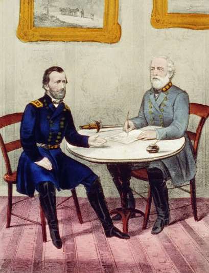 A lithograph depicting Robert E. Lee (right) formally surrendering to General Ulysses S. Grant (Library of Congress)